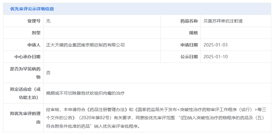 1月10日,CDE官网显示,正大天晴的贝莫苏拜单抗注射液拟纳入优先审评,用于治疗晚期或不可切除腺泡状软组织肉瘤。