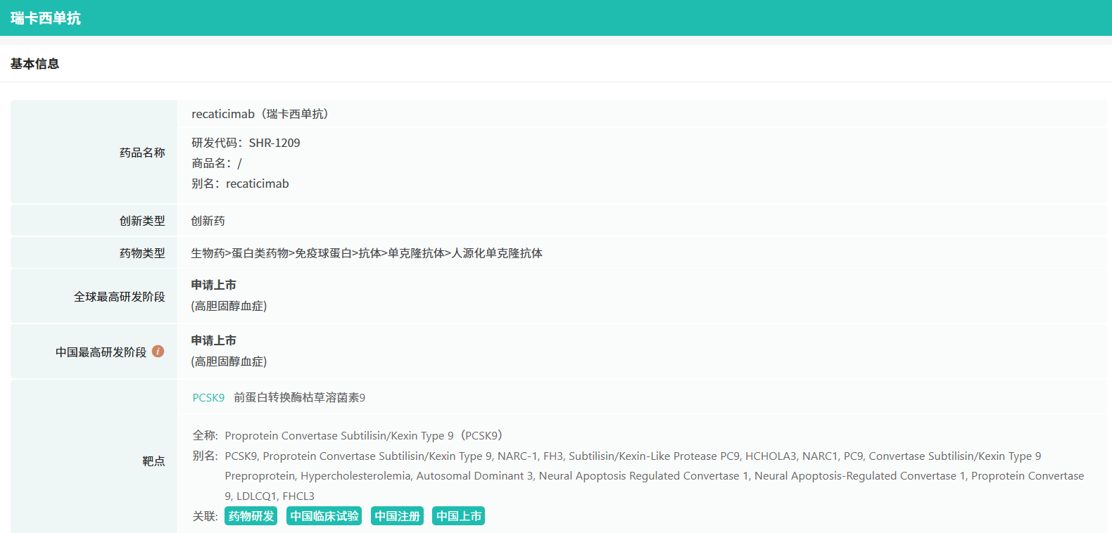 据摩熵医药数据库显示,瑞卡西单抗(recaticimab,SHR-1209)是恒瑞医药开发的一款抗PCSK9单抗,该药可通过与循环中的PCSK9结合,增加肝细胞表面LDLR的表达,促进LDL-C清除,从而达到降低血清LDL-C水平的目的。