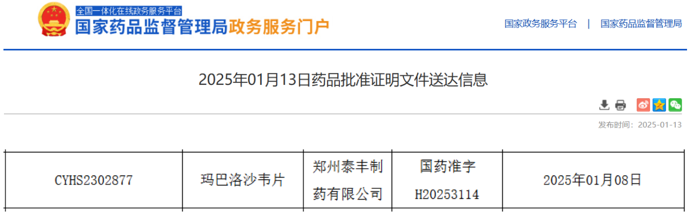 近日,据NMPA官网公示,郑州泰丰制药提交的4类仿制药玛巴洛沙韦片获批并视同通过一致性评价。该药是一种创新的帽状结构依赖性核酸内切酶抑制剂,原研是由盐野义与罗氏携手研发,是继奥司他韦之后推出的第二种口服抗流感病毒药物。