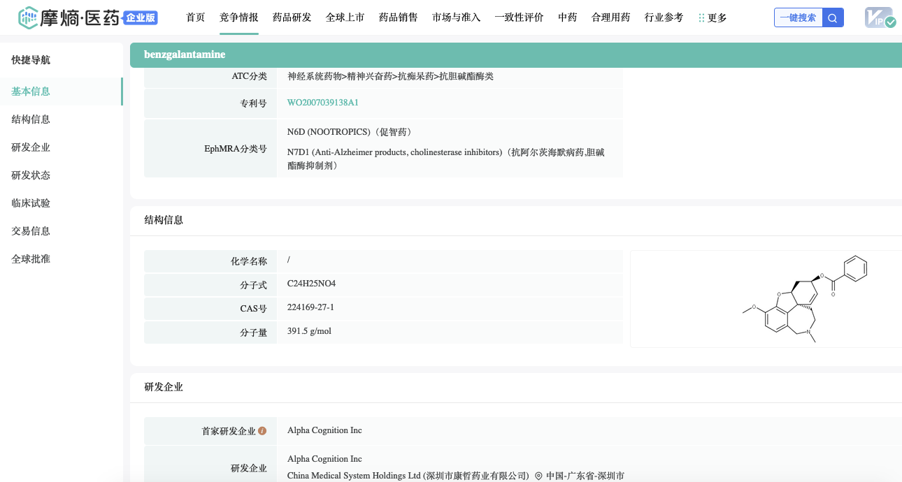 ZUNVEYL/Benzgalantamine 于2024年7月获得美国FDA批准上市,属于新一代乙酰胆碱酯酶抑制剂(AChEI),通过抑制乙酰胆碱酯酶活性、提高中枢乙酰胆碱水平从而改善阿尔茨海默病患者的认知和记忆功能。相关专利有WO2007039138A1。