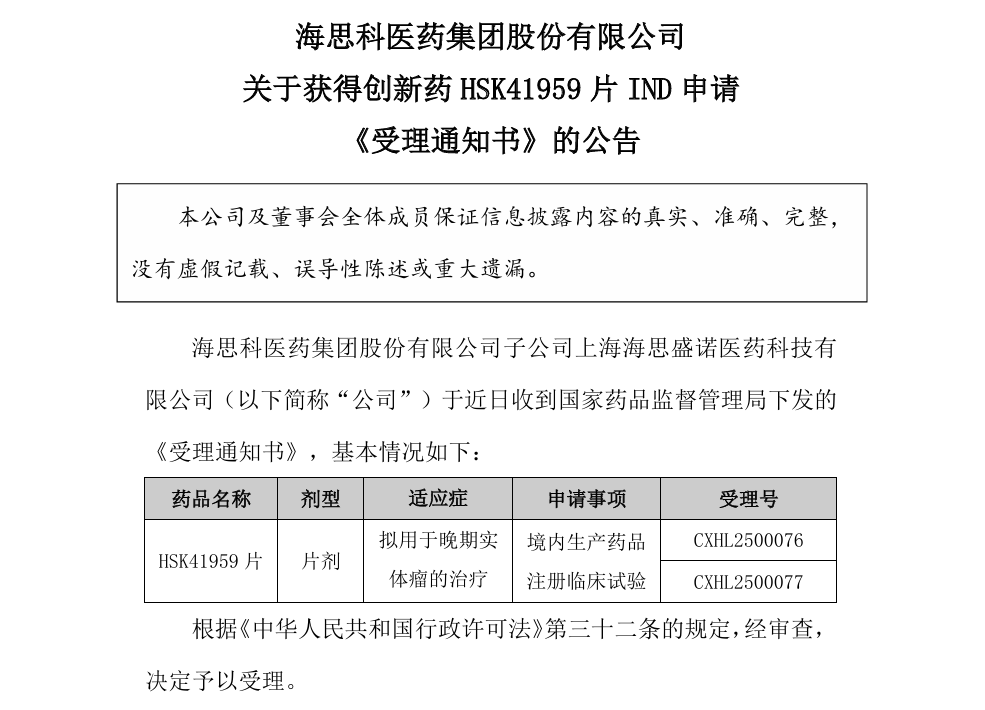 HSK41959是海思科公司自主研发的一种口服小分子抑制剂,具有强效且高度选择性,旨在治疗晚期实体瘤。临床前研究显示,它能有效阻止肿瘤细胞增长,抗肿瘤效果显著,并且安全性高,患者耐受良好,具有较大的安全范围。因此,HSK41959作为一种极具潜力的抗肿瘤新药,有望为晚期实体瘤患者带来新的治疗希望。