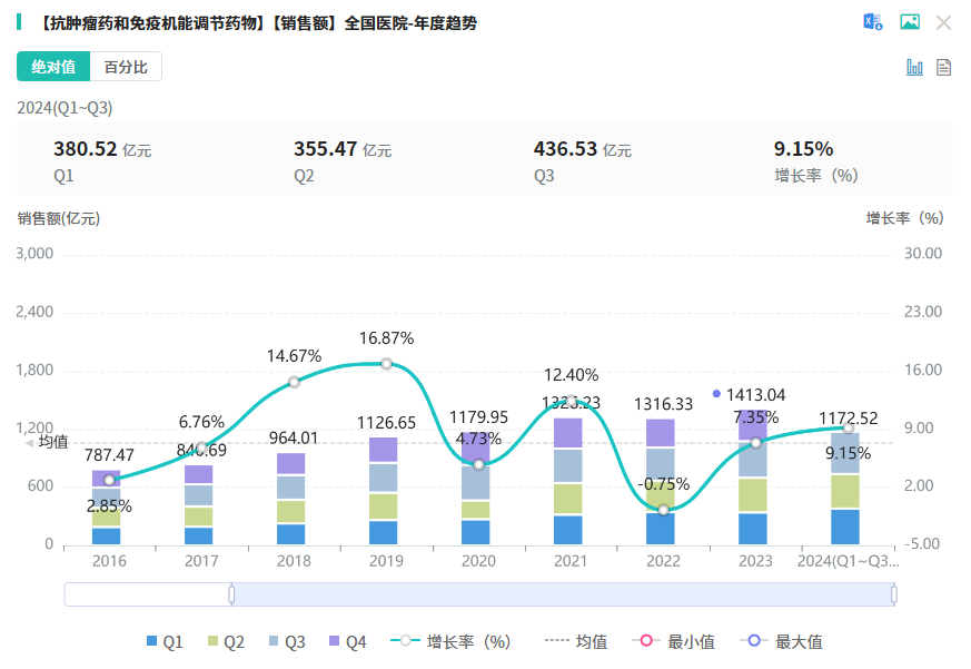 据摩熵医药数据库显示,2024年(Q1-Q3)抗肿瘤药和免疫机能调节药物在全国院内市场的销售总额超1千亿元,同比增长达9.15%。