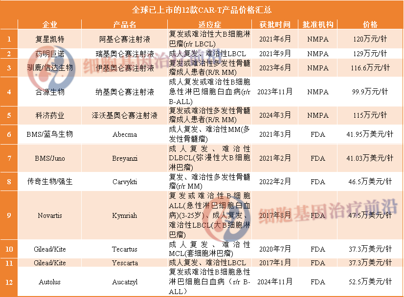 目前中美已经有12款CAR-T产品上市,价格均非常高昂。FDA最早于2017年批准首款CAR-T细胞产品Kymriah,也是第一个被批准用于2种不同适应症的CAR-T疗法,目前该药物在美国定价为Kymriah在美国定价为47.5万美元/针,这还不包括住院费和治疗副作用的药物。