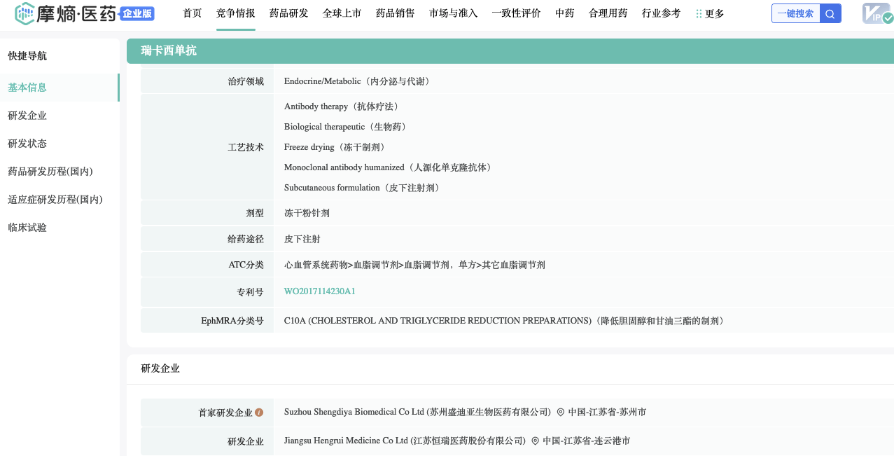 据悉:注射用瑞卡西单抗(研发代码SHR-1209)是恒瑞医药自主研发的抗人前蛋白转化酶枯草溶菌素9(PCSK9)的人源化单克隆抗体,优选lgG1蛋白亚型,提升与抗原结合的特异性和亲和力;并引入“YTE”氨基酸突变技术延长其在体内的半衰期。结构上的双重智选,为瑞卡西单抗在临床研究中取得重要突破性成果奠定了基础。相关专利WO2017114230A1。