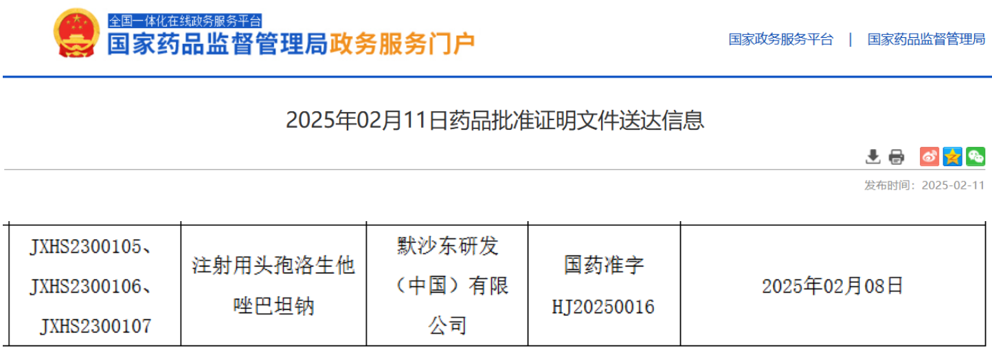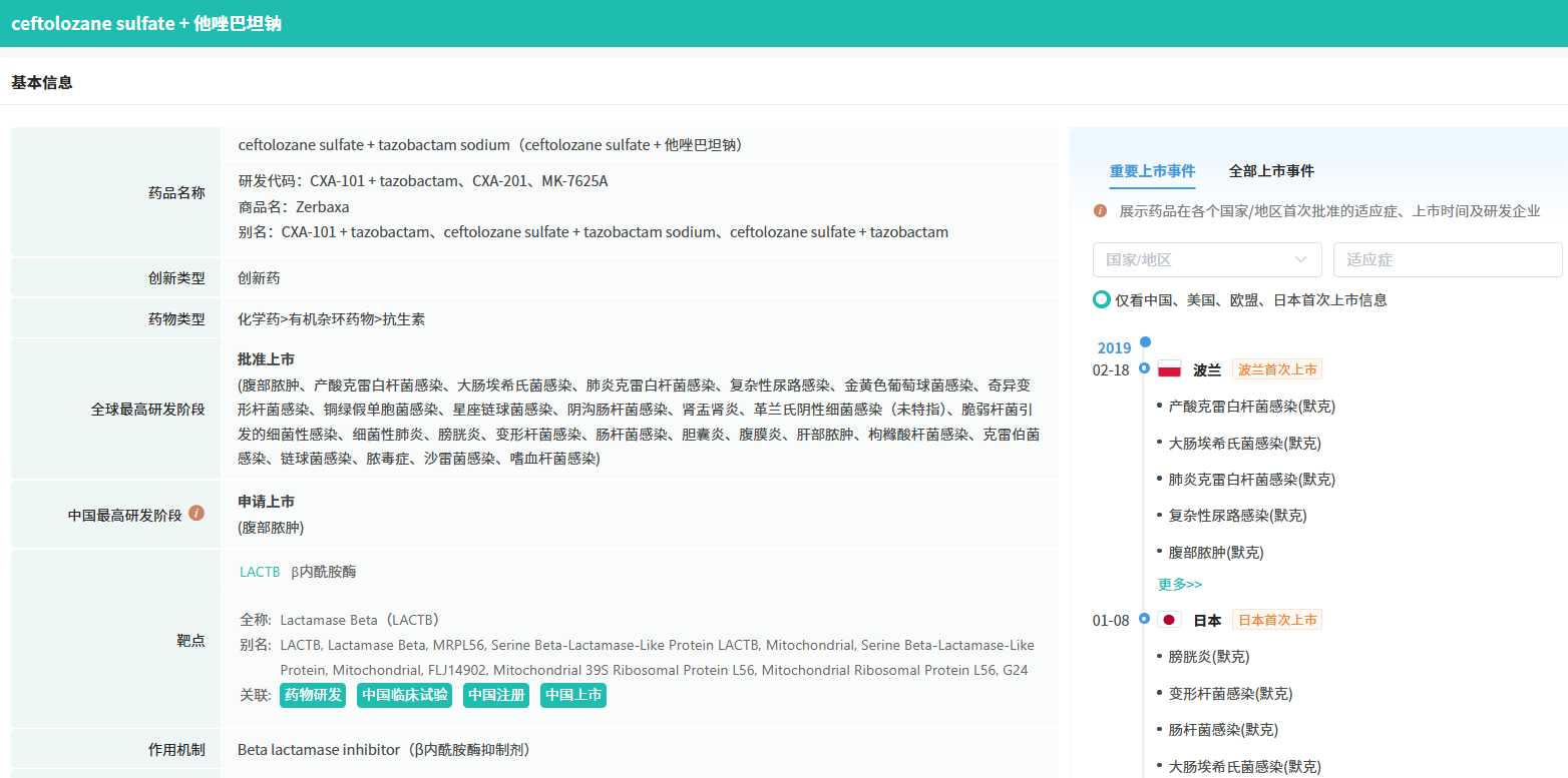2月11日,据NMPA官网最新公示,默沙东提交的5.1类新药注射用头孢洛生他唑巴坦钠(Zerbaxa)上市申请已获得批准。该品种是一款复方抗菌药物,包含头孢类抗生素头孢洛生和β-内酰胺酶抑制剂他唑巴坦。