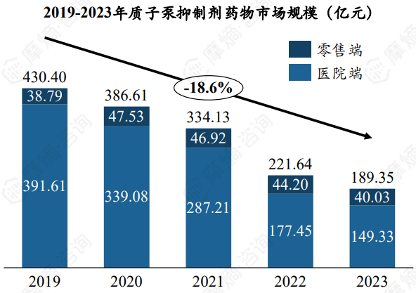 六大PPI药物中,仅有艾普拉唑尚未纳入集采。据摩熵医药销售数据库显示,PPI整体市场规模因集采遭受压缩,从2019年的 430.4亿元缩减至2023年的189.4亿元,年复合增长率为-18.6%。零售端市场相较于医院端变化较小,因此市场占比持续上升, 由不足10%提升到超20%。