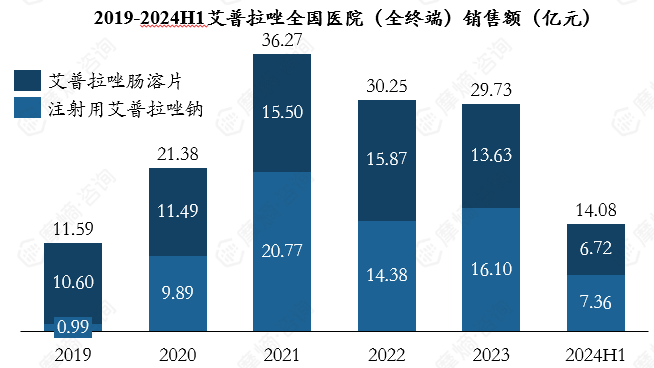 据摩熵医药销售数据库显示,艾普拉唑的销售额在2021年达到峰值36.27亿元,随后因注射剂进入医保,价格由 206元/支降至71元/支,整体市场略有下降,2023年销售额达29.73亿元,注射剂型销售额略高于肠溶片剂。