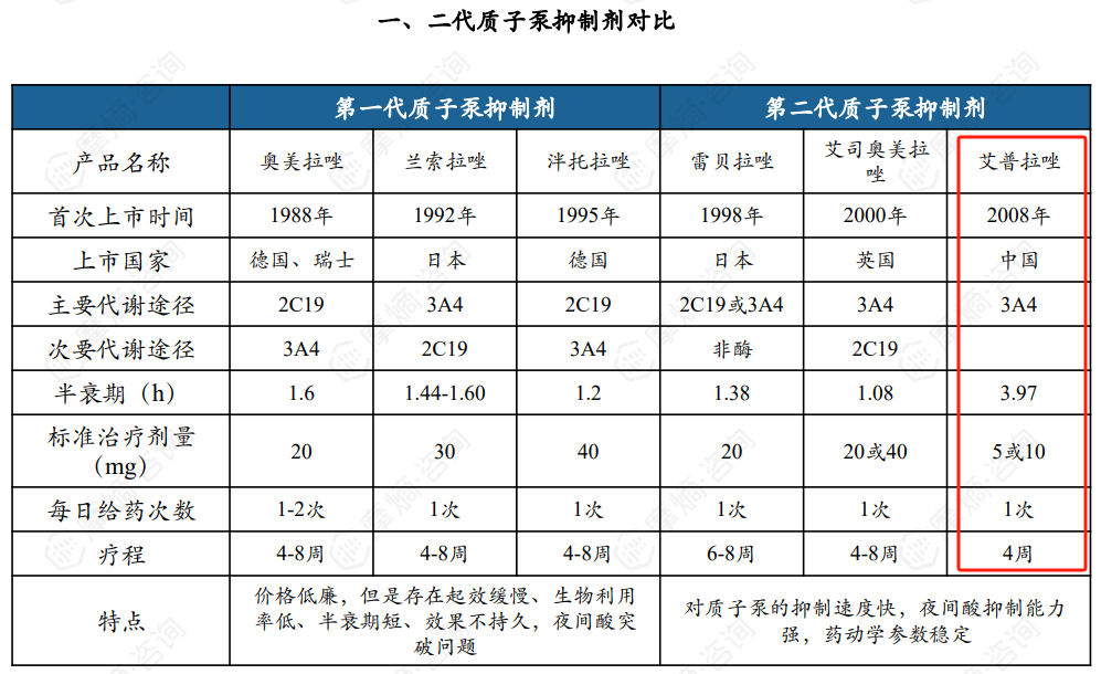 艾普拉唑属于不可逆型的质子泵抑制剂(PPI),是丽珠医药从韩国一洋药品株式会社引进,有注射用艾普拉唑钠和艾普拉唑肠溶片两种剂型,最早于2008年在国内获批上市。适应症包括十二指肠溃疡、胃食管反流病等。