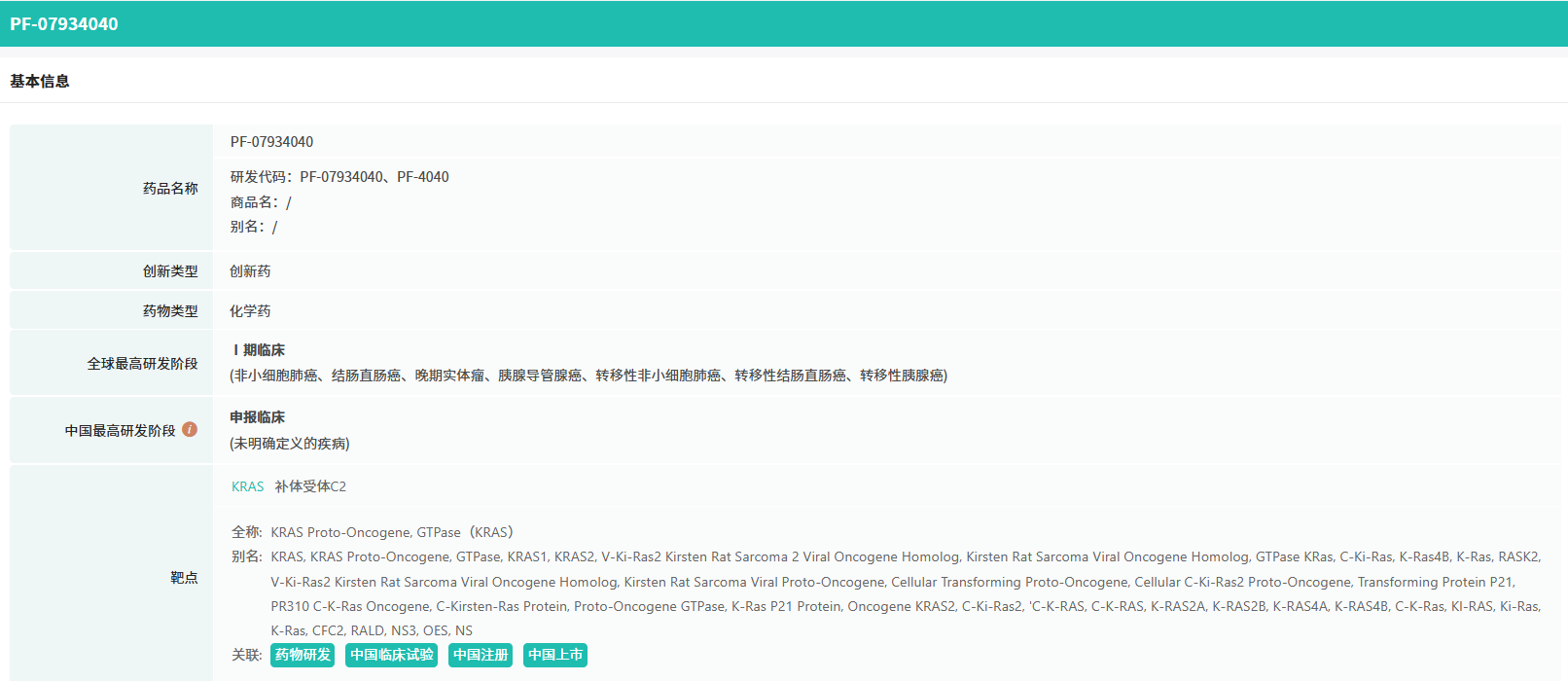 PF-07934040片是辉瑞在研的一款 Pan-KRAS 抑制剂。在海外,辉瑞正在开展一项 I 期临床试验(NCT06447662),以评估 PF-07934040 单药或与其它靶向药物联合治疗 KRAS 基因突变的晚期实体瘤(非小细胞肺癌、结直肠癌、胰腺癌)的疗效和安全性。