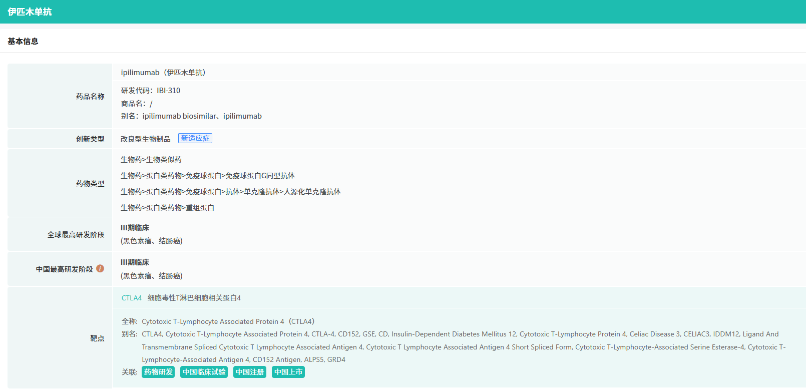 伊匹木单抗(IBI310)是信达开发的一种抗 CTLA4 单抗,它能特异性结合 CTLA-4,从而阻断 CTLA-4 介导的 T 细胞抑制,促进 T 细胞的激活和增殖,提高肿瘤免疫反应,达到抗肿瘤的效果。IBI310 尚未获批,国内最高研发进度是 Ⅲ 期临床。