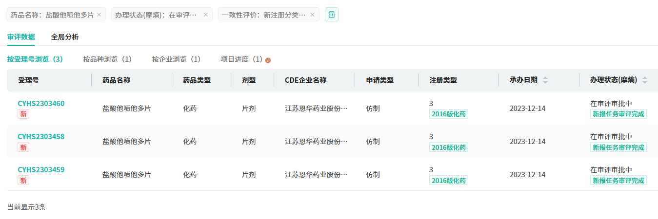 在仿制药布局领域,江苏恩华药业已提交盐酸他喷他多片3类注册仿制药的上市申请,目前处于审评审批阶段,根据药品审评进度预测,预计江苏恩华药业不久将成为国内第2家获批的企业。