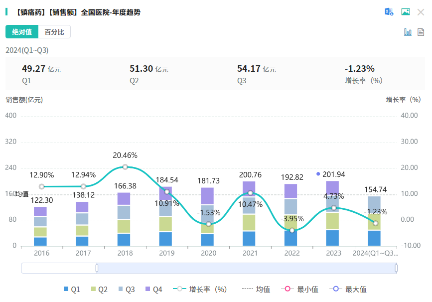 盐酸他喷他多是由美国强生制药和德国Gruenenthal GmbH公司联合研制的新型口服止痛药,是一种新颖的作用于中枢神经系统的口服止痛药物,适用于治疗成人患者需要使用阿片类药物治疗且替代治疗不能充分缓解的急性疼痛。根据IQVIA数据统计,盐酸他喷他多片2023年在全球销售额约为7亿美元。据摩熵医药数据库显示,镇痛药在2023年全国院内市场的销售总额超200亿元,同比增长达4.73%,2024年(Q1~Q3)销售额超154亿元,显示出强劲增长势头。