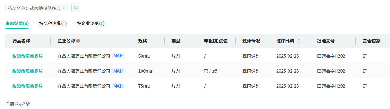 2025年至今,宜昌人福药业有琥珀酸地文拉法辛缓释片、塞来昔布胶囊、富马酸二甲酯肠溶胶囊等5款品种过评,其中盐酸他喷他多片、马来酸咪达唑仑片2款为首家过评品种。