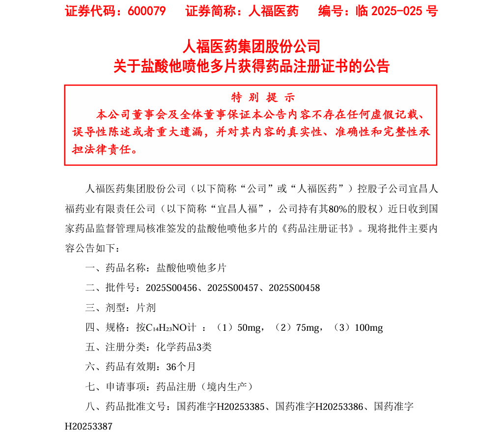 他喷他多目前原研在国内尚未上市,宜昌人福于2023年9月向国家药品监督管理局提交盐酸他喷他多片的上市许可申请并获得受理,此次,宜昌人福药业申报的盐酸他喷他多片获批上市,拿下国内首仿+首家过评,填补国内空白。盐酸他喷他多片的获批上市,不仅丰富了人福药业的产品线,更将为公司带来显著的积极影响。