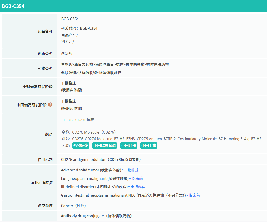 据摩熵医药数据库显示,BGB-C354是一款针对B7H3靶点的抗体偶联药物(ADC),由百济神州自主研发。B7H3作为B7家族的一员,在多种癌症中呈现过度表达,与不良预后密切相关。因此,靶向B7H3的抑制剂被视为新的抗肿瘤治疗选择,具有广阔的应用前景。