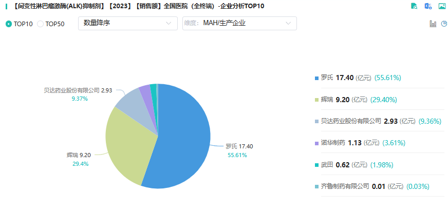 竞争格局方面,2023年罗氏占据56%的院内市场,其次为辉瑞,市场份额约29%,贝达药业恩沙替尼院内销售额约2.93亿元,占据9%的院内市场份额。此外,诺华、武田、齐鲁制药等企业也占据一席之地。
