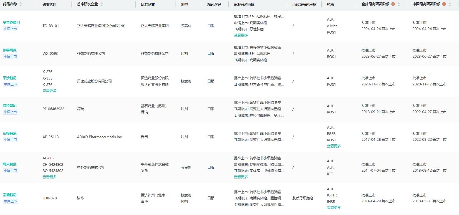已上市第二代ALK抑制剂包括诺华的塞瑞替尼(2018年)、罗氏的阿来替尼(2018年)、贝达药业的恩沙替尼(2020年)、武田的布格替尼(2022年)、辉瑞的洛拉替尼(2022年)、齐鲁制药的伊鲁阿克(2023年)以及正大天晴的安奈克替尼(2024年)。