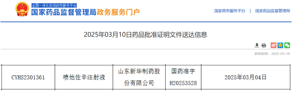 3月10日,据NMPA官网最新显示,山东新华制药提交的3类仿制药喷他佐辛注射液申请获批上市并视同通过一致性评价,为第4家获批并过评该品种的药企。