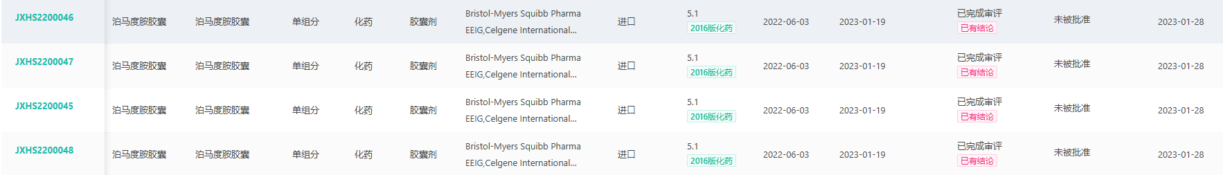不过,泊马度胺原研产品并未在国内获批上市。据摩熵医药中国药品审评数据库显示,2022年6月,原研百时美施贵宝/新基提交了泊马度胺胶囊上市申请,2023年1月,国家药监局发布通知,该药上市申请未被批准。
