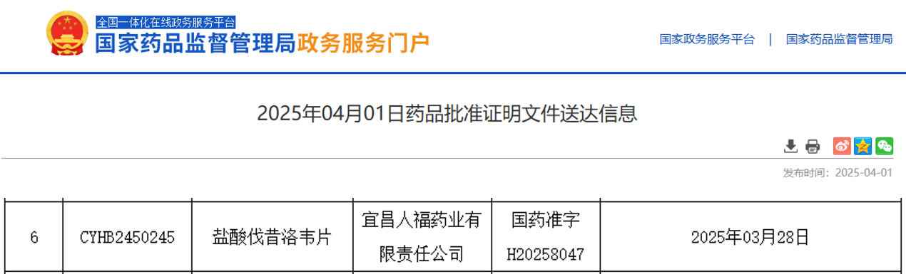 4月1日,据NMPA官网显示,宜昌人福药业提交的原6类仿制药盐酸伐昔洛韦片获批并通过一致性评价。据摩熵医药数据库显示,该品种除宜昌人福药业过评外,另有其他5家公司过评。