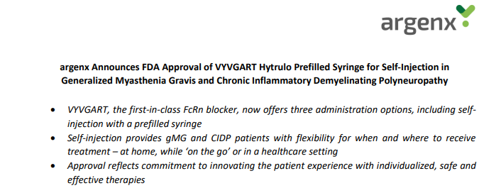 4月11日,再鼎医药与其合作伙伴argenx公司共同宣布,美国食品药品监督管理局(FDA)已正式批准艾加莫德预充式皮下注射剂型上市,用于治疗乙酰胆碱受体(AChR)抗体阳性的全身型重症肌无力(gMG)成人患者和慢性炎性脱髓鞘性多发性神经根神经病(CIDP)成人患者。