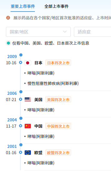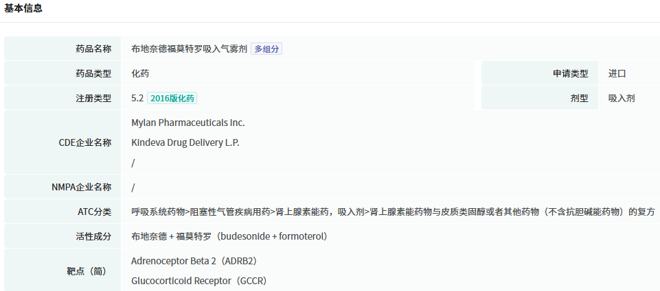 布地奈德福莫特罗为全球首个将糖皮质激素与长效支气管扩张剂完美结合的吸入制剂,用于需要联合应用吸入皮质激素和长效β2-受体激动剂的哮喘病人的常规治疗。据摩熵医药数据库的全球药物研发数据库显示,该药最早于2001年在欧盟上市,随后2004年在国内获批上市,于2006年在美国获批上市。