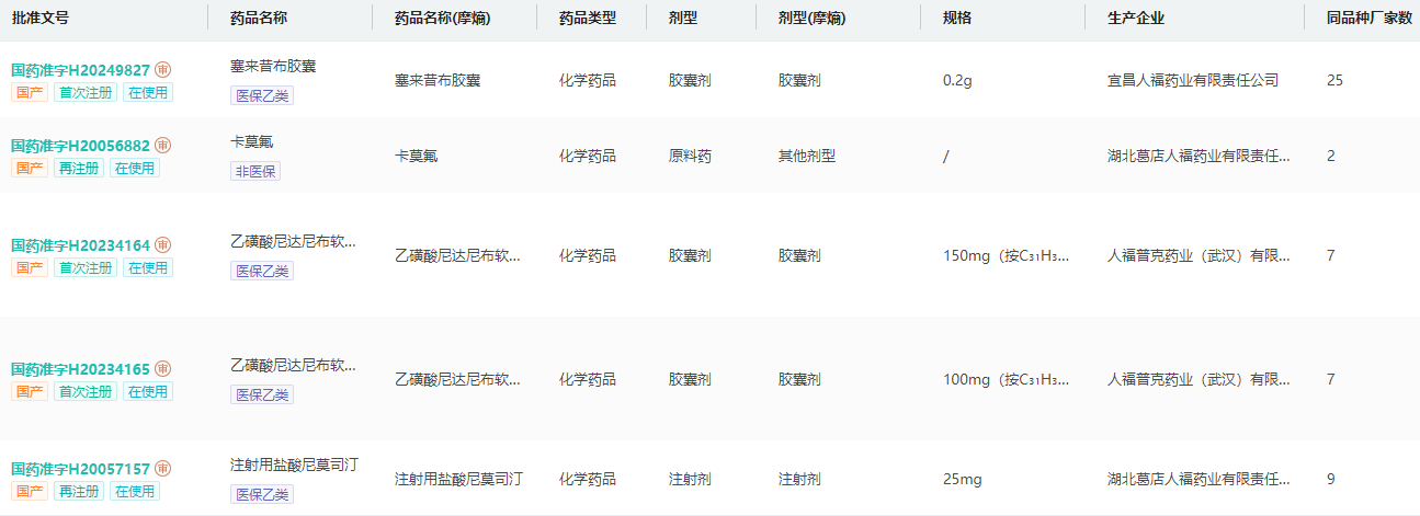 人福医药抗肿瘤药领域生产批文信息
