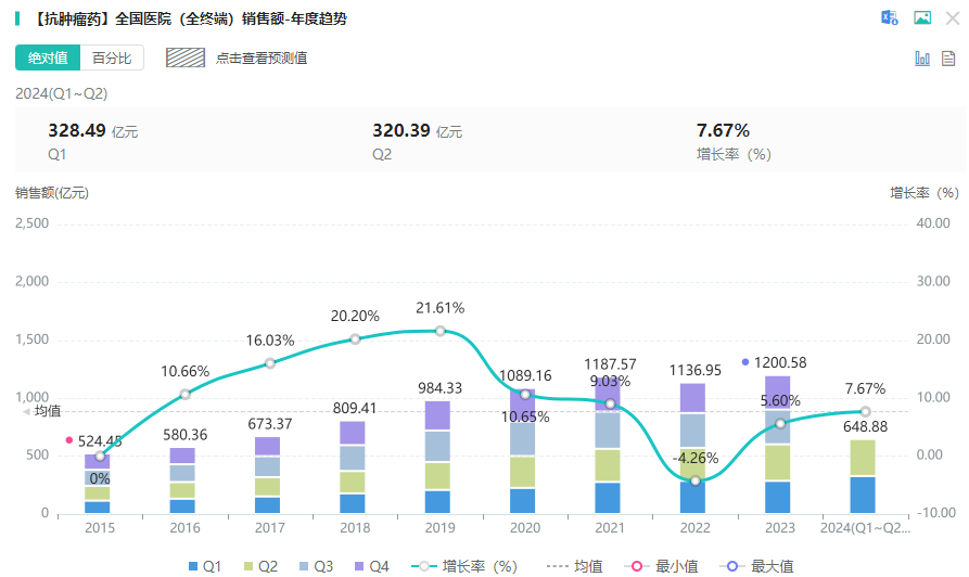 据摩熵医药数据库显示,近年来中国医院全终端市场抗肿瘤药(化药+生物药)销售额均达千亿规模,2023年超过1200亿元,同比增长5.60%;2024年Q1~Q2以7.67%的增速增长至近650亿元。