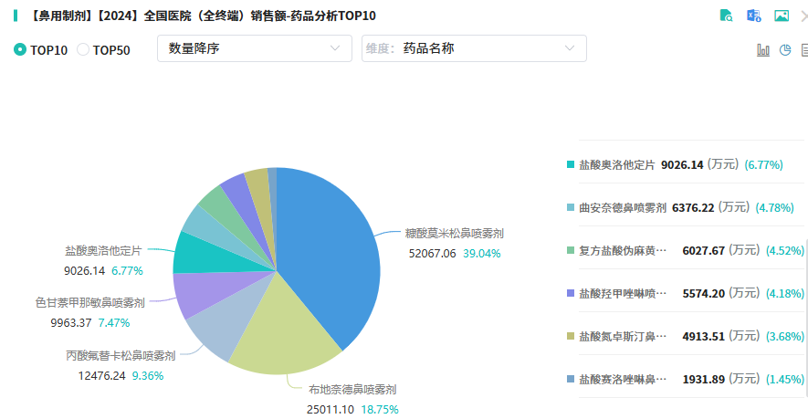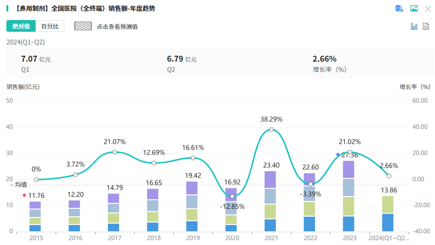 据摩熵医药数据库的销售数据库显示,2023年全国医院端鼻用制剂规模为27.36亿元,2024上半年为13.86亿元。