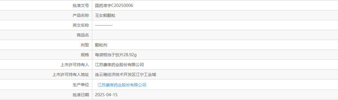 康缘药业,作为国内大型的现代中药研发、生产、销售企业,在行业内一直颇具影响力。自2020年起,康缘药业便保持着每年都有中药新药获批上市的强劲势头,据摩熵医药数据库显示,目前康缘药业古代经典名方已累计获批4款,而玉女煎颗粒,正是其在2025年收获的首个硕果。