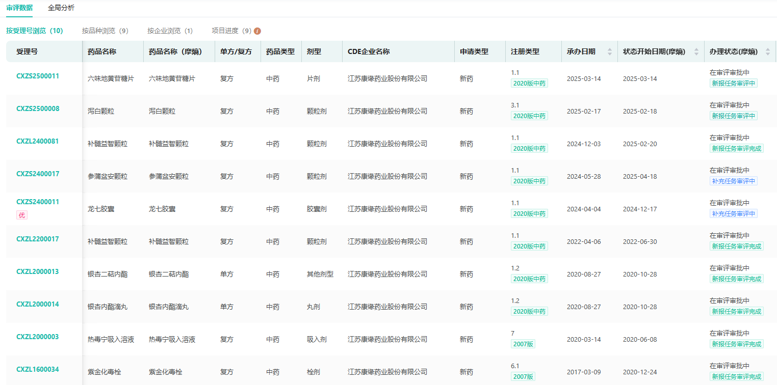 康缘药业申报在审的中药新药