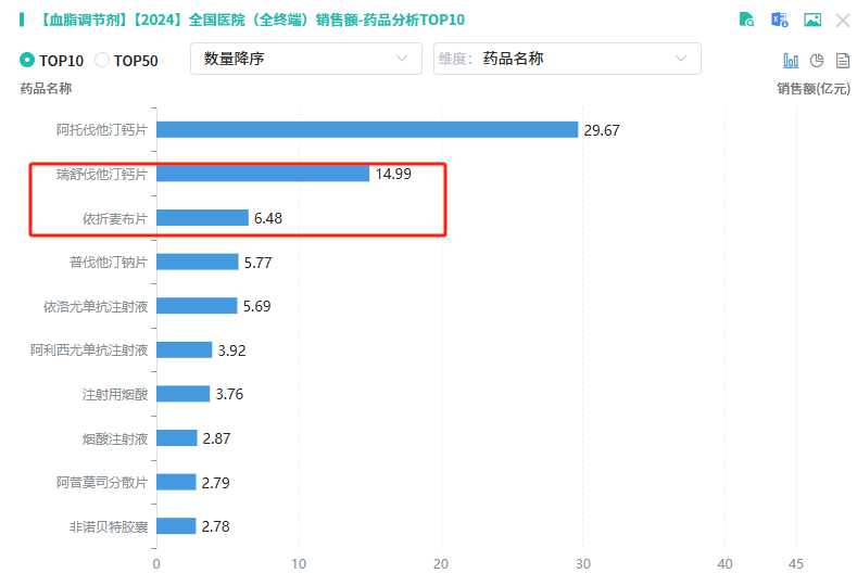 据摩熵医药数据库-销售数据库显示,2023年国内医院端血脂调节剂的市场规模为187亿元,2024上半年为94.8亿元,其中瑞舒伐他汀依折麦布片中的单方制剂依折麦布片和瑞舒伐他汀相关制剂,在国内医院2024上半年的销售额分别为6.48亿元和14.99亿元。而在临床上,单片复方制剂可以减少服药频次和数量,其在便利性和依从性上的优势,可以在血脂管理这场“持久战”中发挥出更高的临床价值。