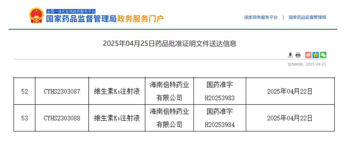 4月25日,国家药监局官网显示,倍特药业旗下海南倍特药业有限公司生产的维生素K1注射液(3类化药)获批上市,成为首家过评的维生素K1注射液。