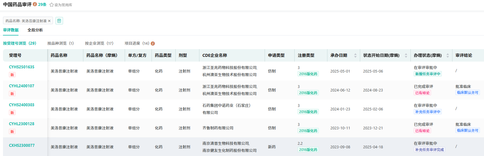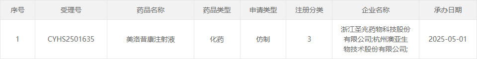 5月1日,CDE官网受理了浙江圣兆药物科技股份有限公司&杭州澳亚生物技术股份有限公司的美洛昔康注射液仿制上市申请。这是继石药集团中诺药业递交仿制药上市申请的第二家。