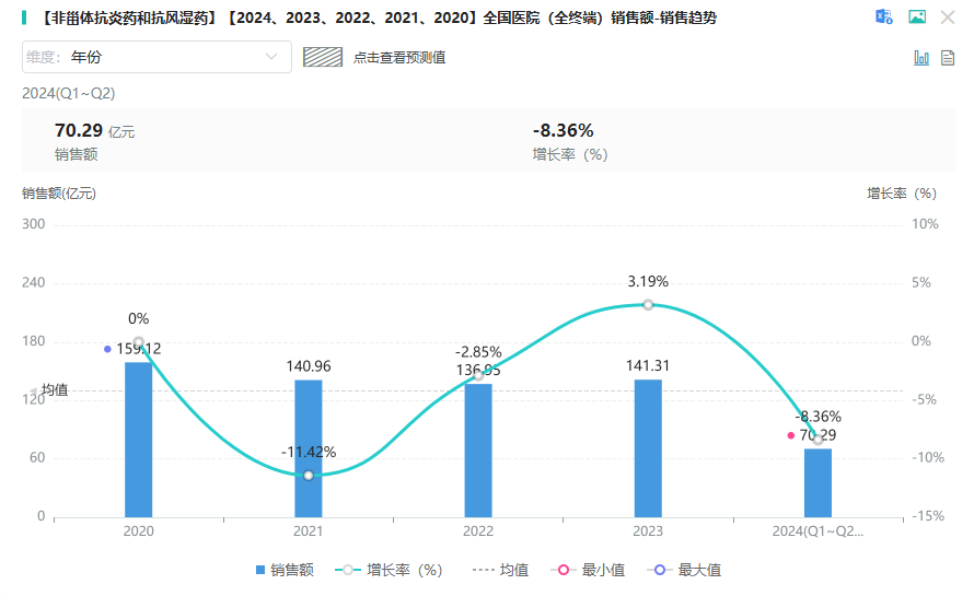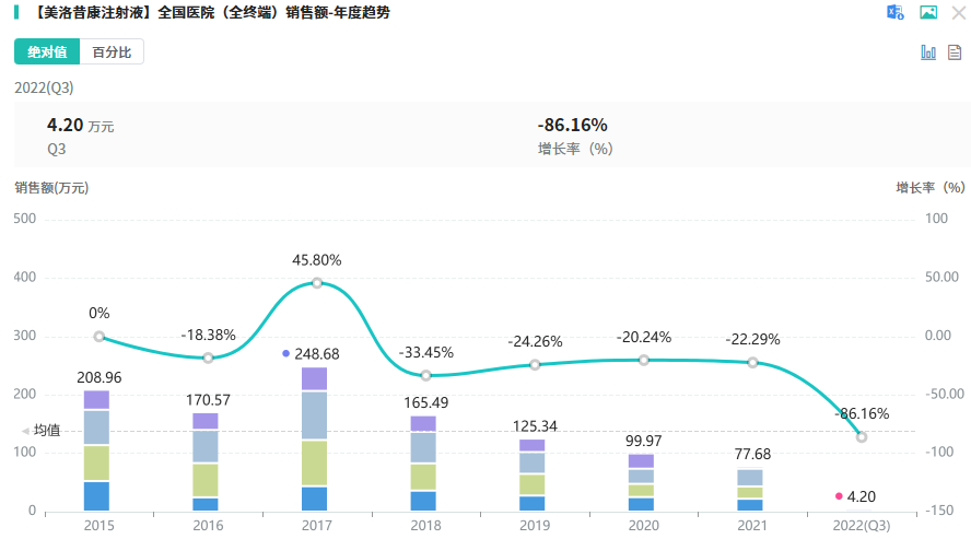 根据摩熵医药数据库-销售数据库显示,受2019年集采影响(美洛昔康片为第二批集采品种 ),美洛昔康销售额自2020年开始呈显著下降趋势,2021年后逐渐趋于稳定,2023年的销售额为4248.71万元,2024上半年销售额为1617.98万元。