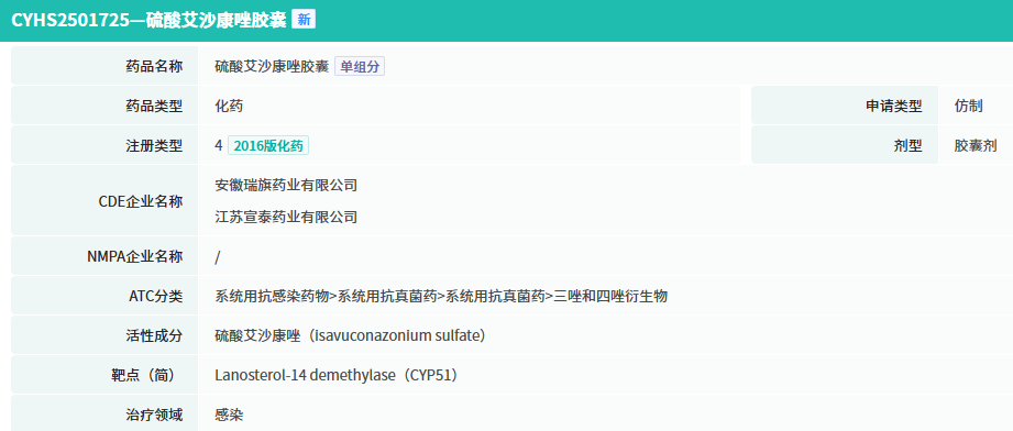 2025年5月13日,瑞旗药业&宣泰药业研发的硫酸艾沙康唑胶囊4类仿制药上市申请获得CDE受理,国内暂无该药仿制药获批上市。