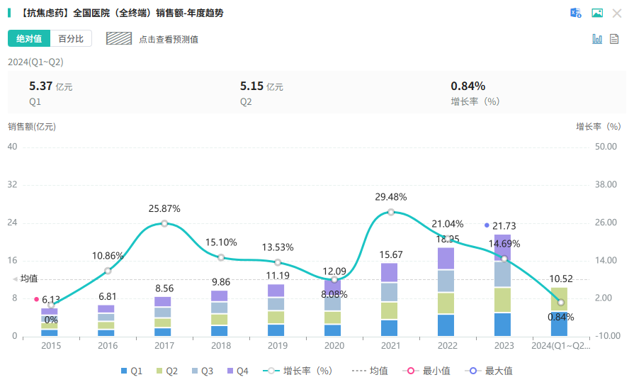 据摩熵医药全国医院销售(全终端)数据库显示,近年来我国抗焦虑药市场规模持续攀升,由2015年6.13亿元增长至2023年21.73亿元,复合年增长率达17.14%。2023年销售额排名前五的抗焦虑药品种分别为枸橼酸坦度螺酮胶囊(7.16亿元)、劳拉西泮片(2.94亿元)、盐酸丁螺环酮片(2.88亿元)、阿普唑仑片(2.77亿元)以及奥沙西泮片(2.74亿元)。