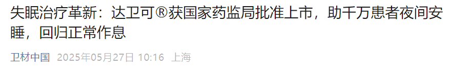 今日,卫材宣布卫材原研的双食欲素受体拮抗剂——莱博雷生(Lemborexant)(中文商品名:达卫可®)正式获得中国国家药品监督管理局(NMPA)批准上市,用于治疗成人失眠,特别是入睡困难和/或睡眠维持困难。