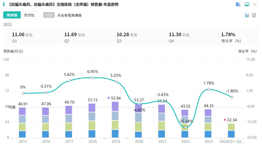 据摩熵医药-销售数据库显示,偏头痛在全国医院(全终端)2023年销售额为44.33亿元,2024上半年为22.34亿元。其中大部分为中药,如养血清脑颗粒、天麻素注射液、氢溴酸樟柳碱注射液。