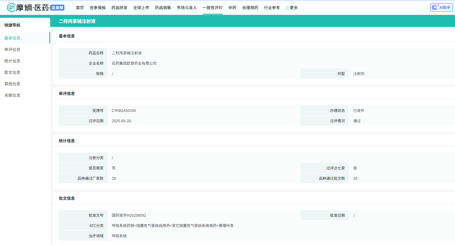 5月28日,据摩熵医药数据库的最新数据显示,石药集团欧意药业有限公司提交的二羟丙茶碱注射液已通过仿制药一致性评价。