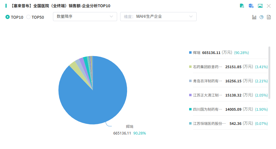 目前,国内塞来昔布市场呈现“原研药主导、仿制药围剿”的竞争格局。原研药由辉瑞开发,2000年进入中国市场,尽管专利已到期,但凭借品牌优势仍占据绝大部分的市场份额。然而,随着施美药业、人福医药等本土药企的仿制药陆续获批,原研药的市场份额正被蚕食。