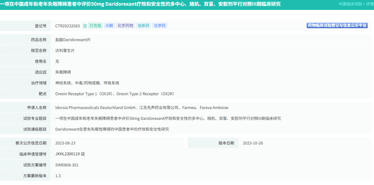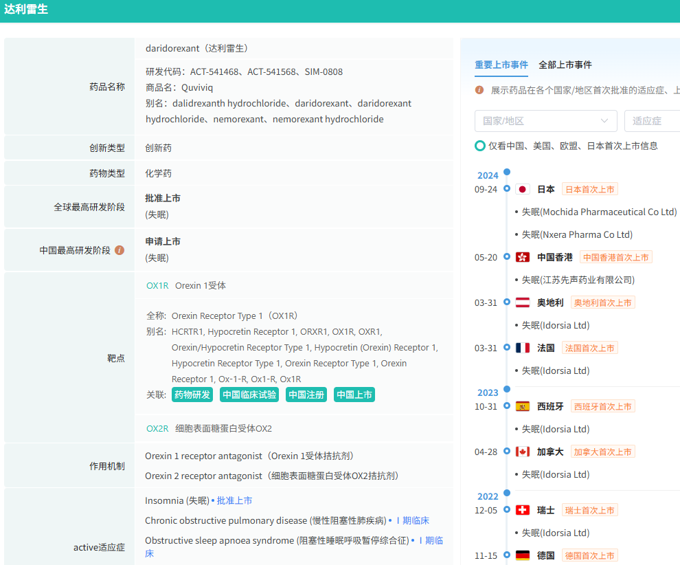 2022年1月,盐酸达利雷生片在美国获批上市,商品名Quviviq,用于治疗特征为入睡和/或睡眠维持困难的成人失眠症患者。同年11月,先声药业与Idorsia达成协议,以5000万美元的总交易额获得达利雷生在大中华地区的开发和商业化权益。