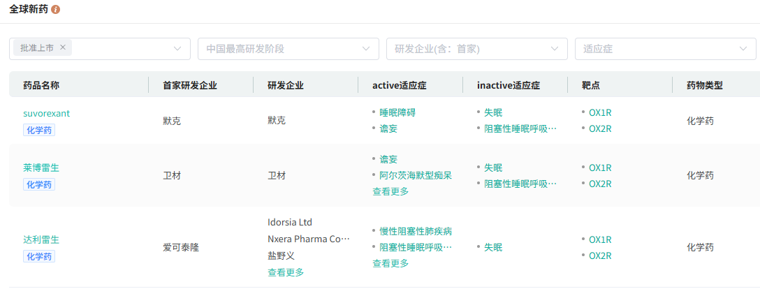目前,全球共3款OX1R/OX2R拮抗剂上市,除达利雷生外,还有默沙东的苏沃雷生(商品名:Belsomra)和卫材的莱博雷生(商品名:Dayvigo)。