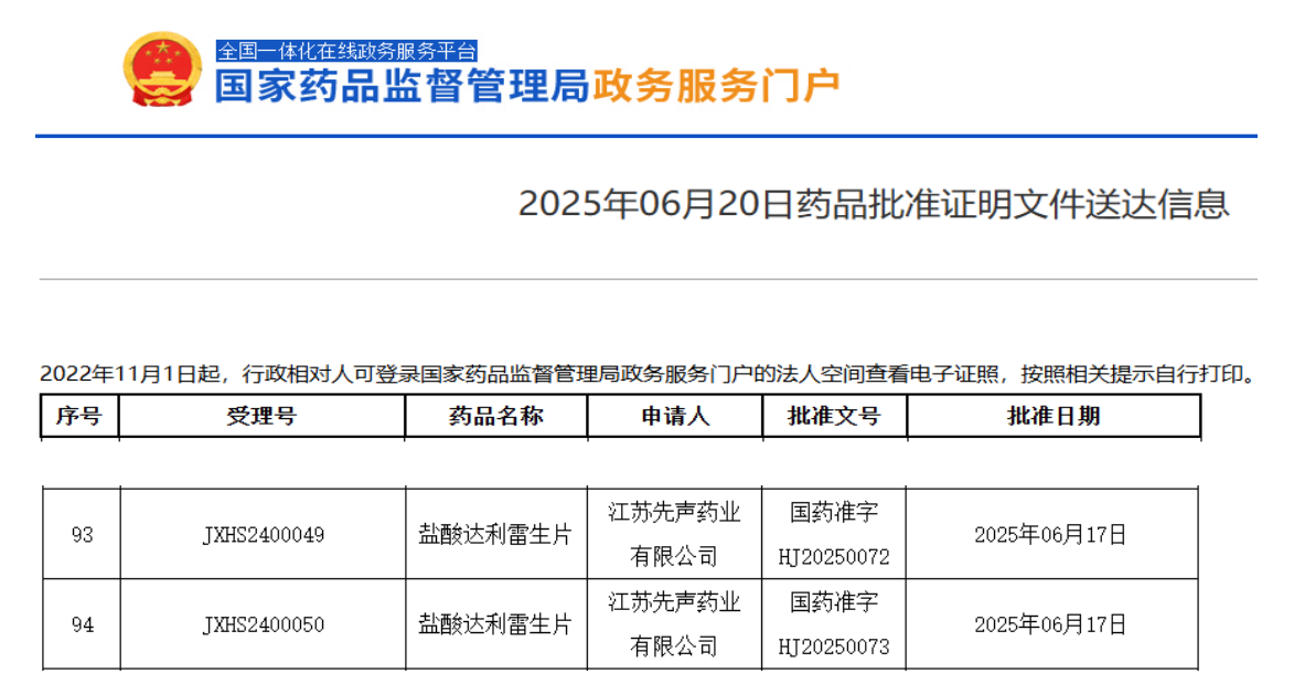 当前,盐酸达利雷生片已在美国、英国、欧盟、瑞士、加拿大等地获批上市。