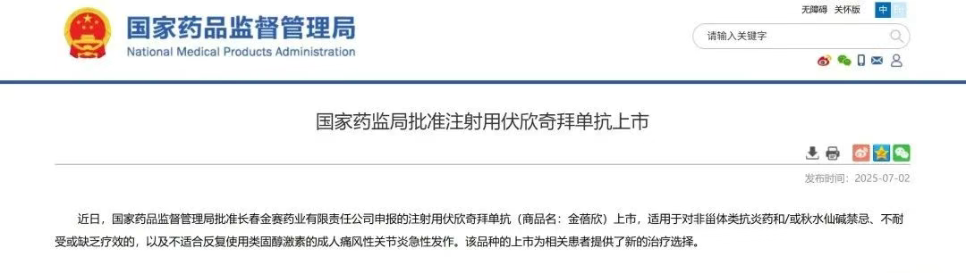 伏欣奇拜单抗注射液(曾用名:金纳单抗注射液)由长春金赛药业有限责任公司自主研发,是一种抗白介素 1β(IL-1β)单抗,属于治疗用生物制品 1 类新药。其作用机制是通过阻断 IL-1β 与 IL-1 受体 I(IL-1RI)和 IL-1 受体 II(IL-1RII)结合,起到调节炎症的作用,从而缓解痛风性关节炎的症状。