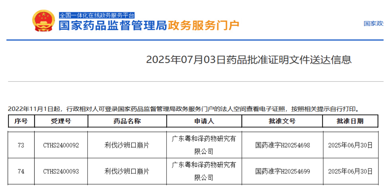 7月3日,国家药监局(NMPA)官网显示,广东粤和泽药物研究有限公司按仿制3类申报的利伐沙班口崩片获批上市,为该剂型首仿+首家过评。