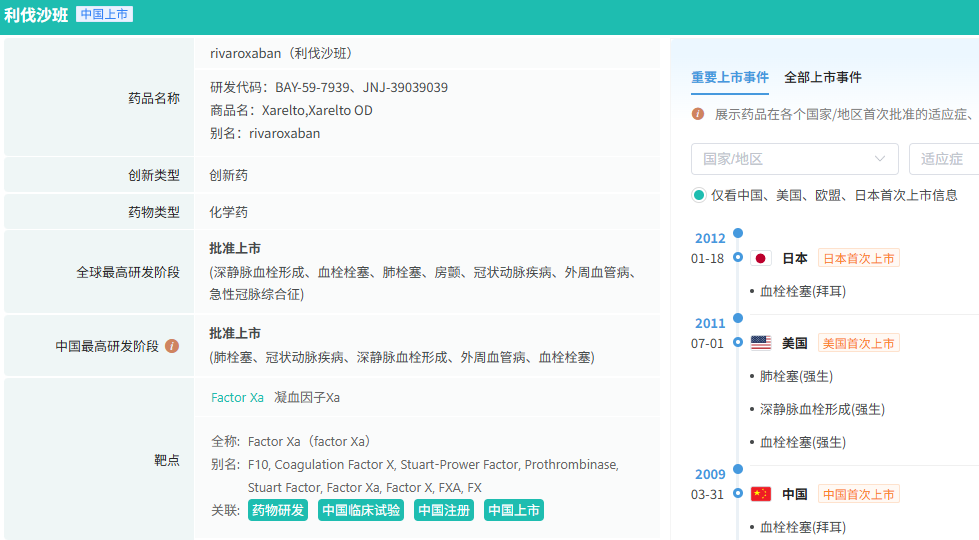 利伐沙班由拜耳(Bayer)和杨森(Janssen)联合开发,最早于2008年9月获加拿大卫生部批准上市,2009年在中国获批上市,商品名“拜瑞妥”,同年进入国家医保目录。2018年纳入国家基本药物目录,是目前安全用药经验人群最广的新型口服抗凝药。