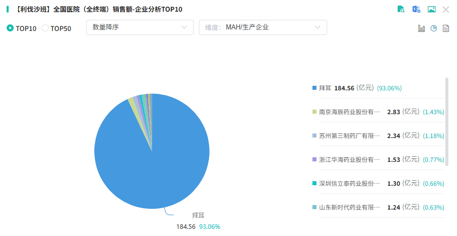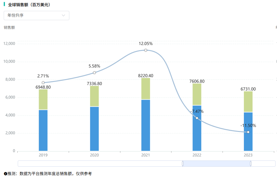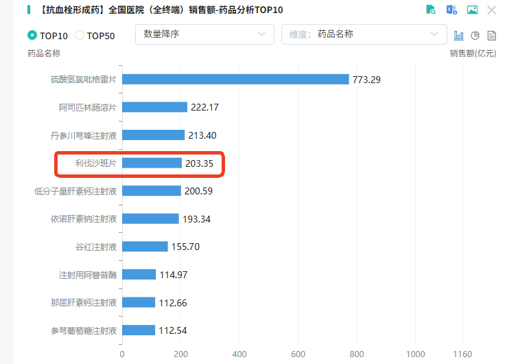 作为全球畅销药物之一,利伐沙班销量十分可观。摩熵医药数据库显示,2021年利伐沙班全球销售额达到峰值,超过82亿美元,2022年销售额约为76亿美元,高居全球畅销药榜第7位。