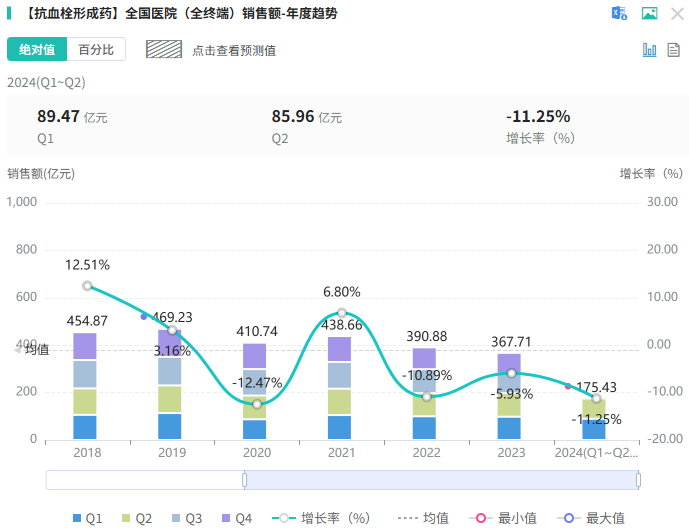 在国内市场上,利伐沙班片的销售额一直稳步上涨。据摩熵医药数据统计,当前利伐沙班院内累计销售额突破200亿元。2020年同比增长37.72%,达到35.54亿元,2021年再增24.95%,销售额超44亿元。利伐沙班片被纳入第五批集采后,2022年开始销售额有所下降,但近两年也呈现市场回暖迹象。