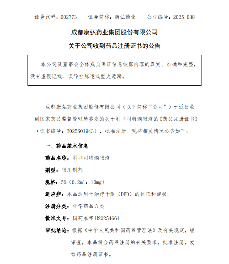 近日,据康弘药业官方公告显示,其自主研发的3类仿制药利非司特滴眼液(商品名:朗悦明®)正式获批上市,并视同通过一致性评价。作为国内首家完成临床研究并获批的企业,康弘药业不仅填补了国产干眼症治疗领域的空白,更以“全链条抗炎”机制为3亿干眼症患者提供了全新选择。